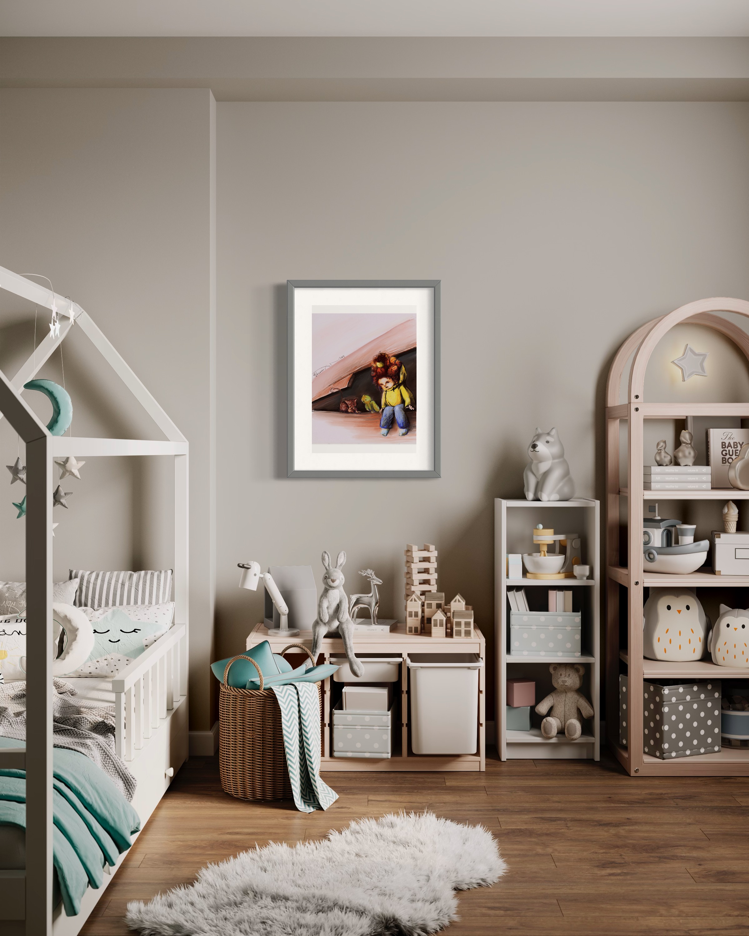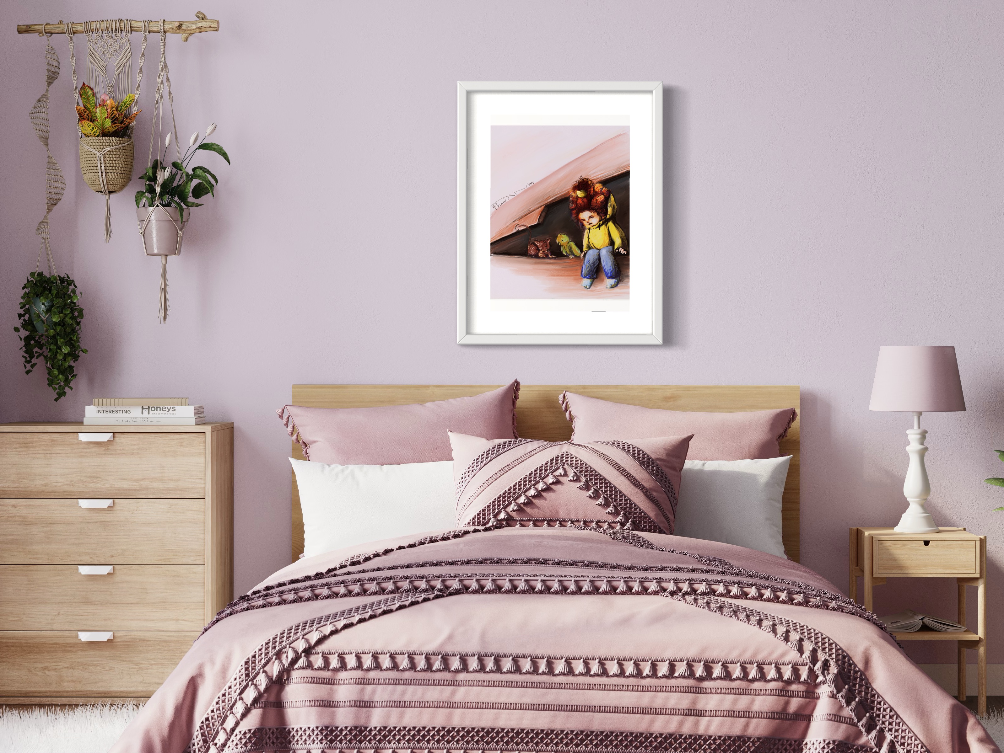 Cartoon, Fantasy, Children, Kids Room Decor, Cat, Bird, Girl, Yellow, Narrative Art, Comic Book, Painting, Wave.
