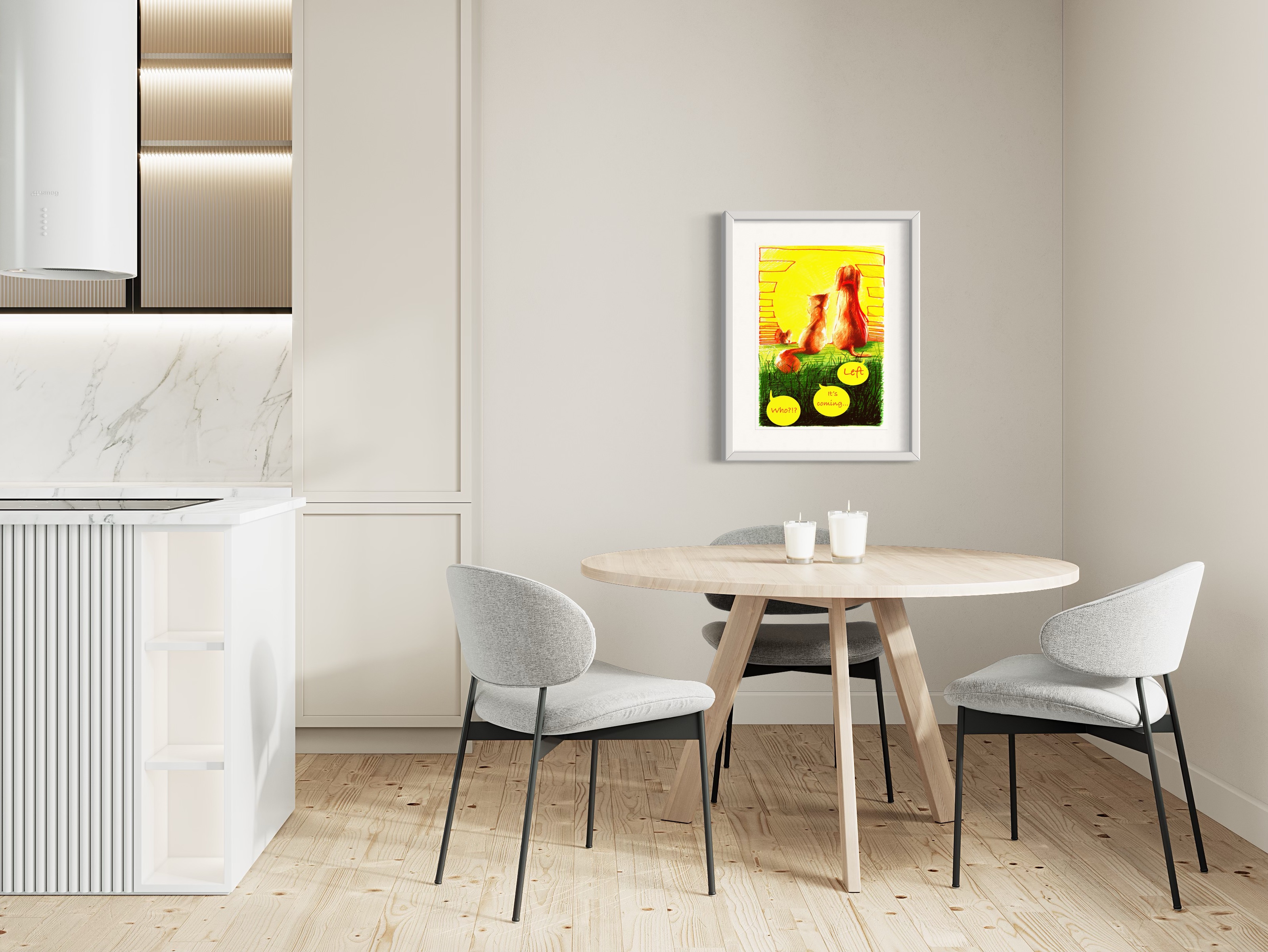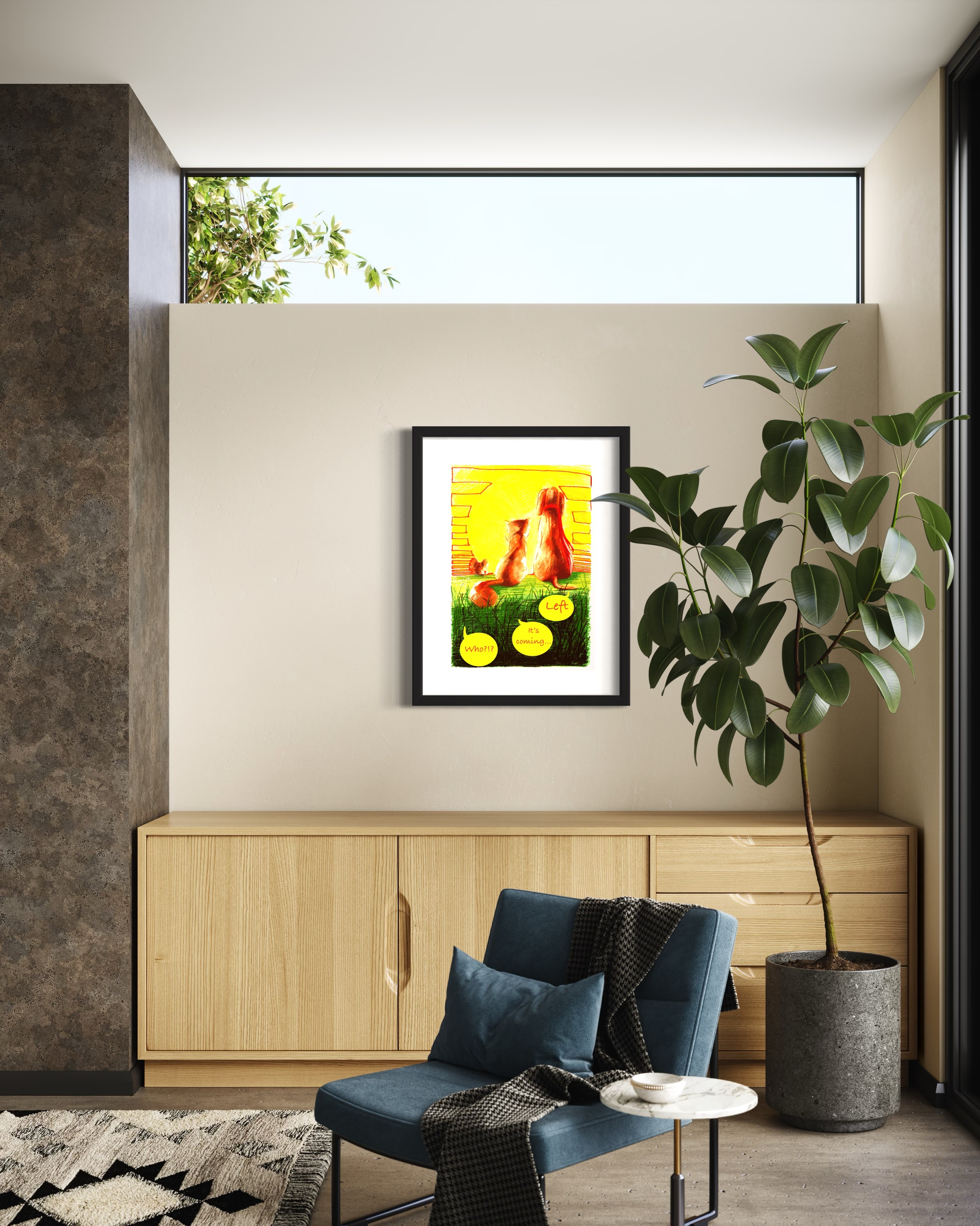 Animals, Cat, Dog, Sun, Sunset, Colourful, Comic, Narrative Art, Kids Room, Painting,Wave.